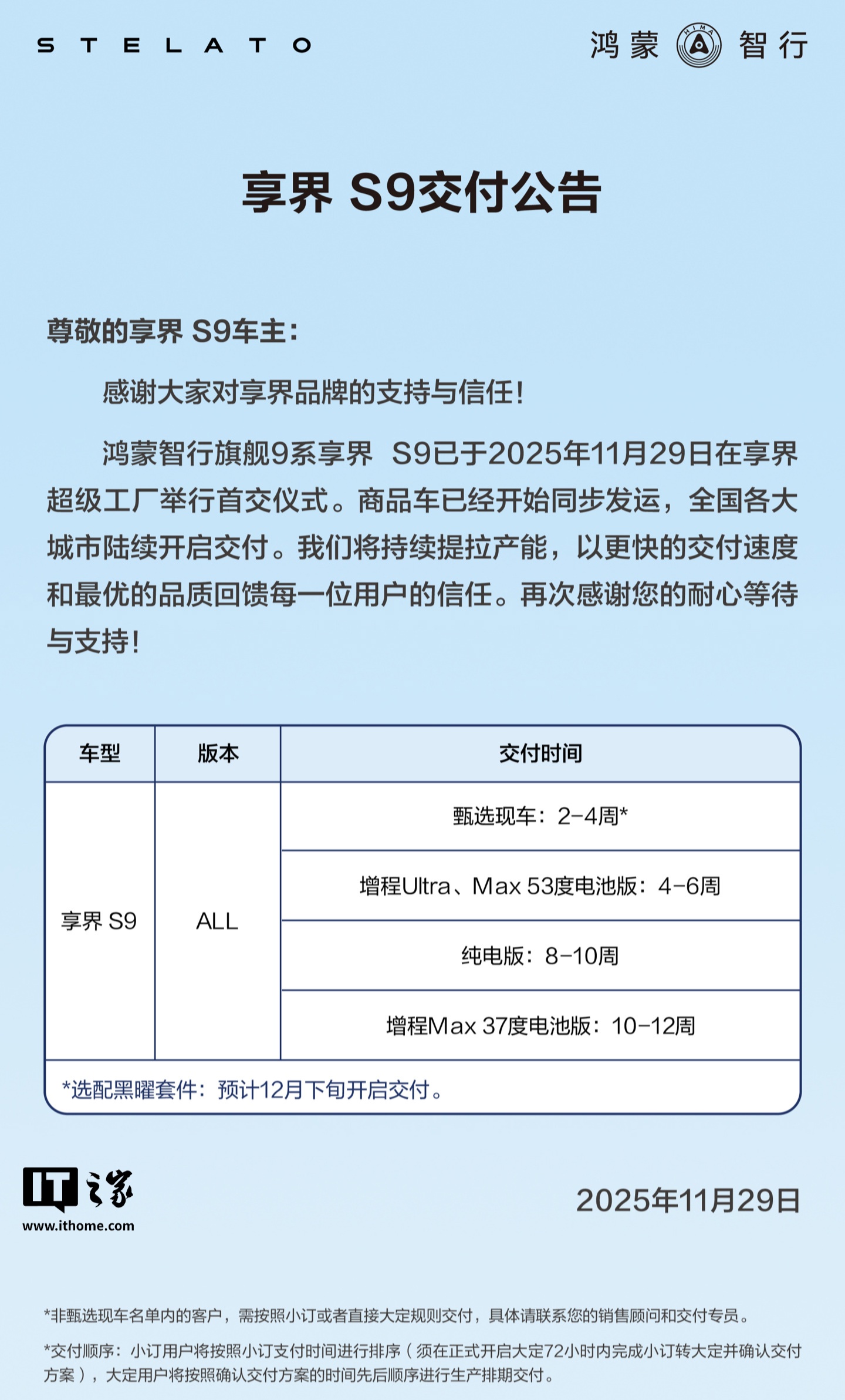 鸿蒙智行官方还公布了享界 S9 的交付时间汇盈配资,IT之家附如下: